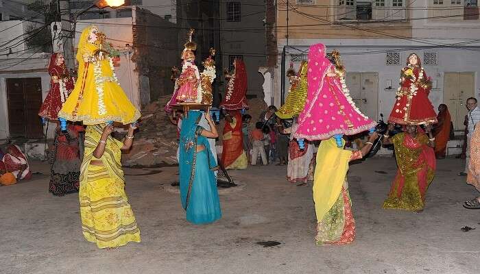 In Jodhpur and Bikaner, the focus is more on community participation. Women gather in neighbourhood groups, sing local folk songs and carry idols through residential areas.